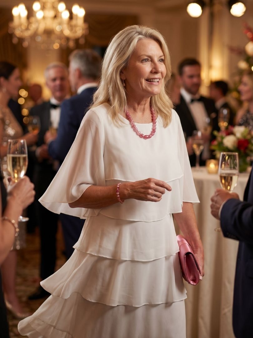 This dress features a tiered layered design through the front with a soft, fluid shape that falls neatly along the body. The fabric feels smooth with a gentle weight, allowing it to hold its shape while remaining comfortable. It works well for everyday occasions that call for a more composed look.